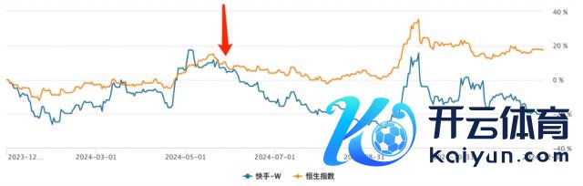 若用成本市集推崇进行考据上述不雅点则更为了了,2024 年开局之后虽偶有弯曲快手和恒生指数大盘仍然保持了高度的关系性,属基本于同频共振,知谈 5 月下旬之后,两条折线越发折柳,直到如今。